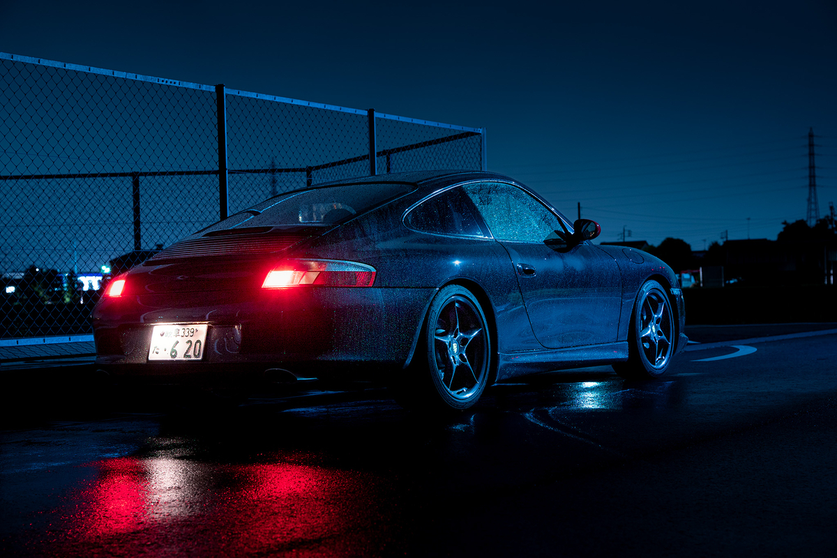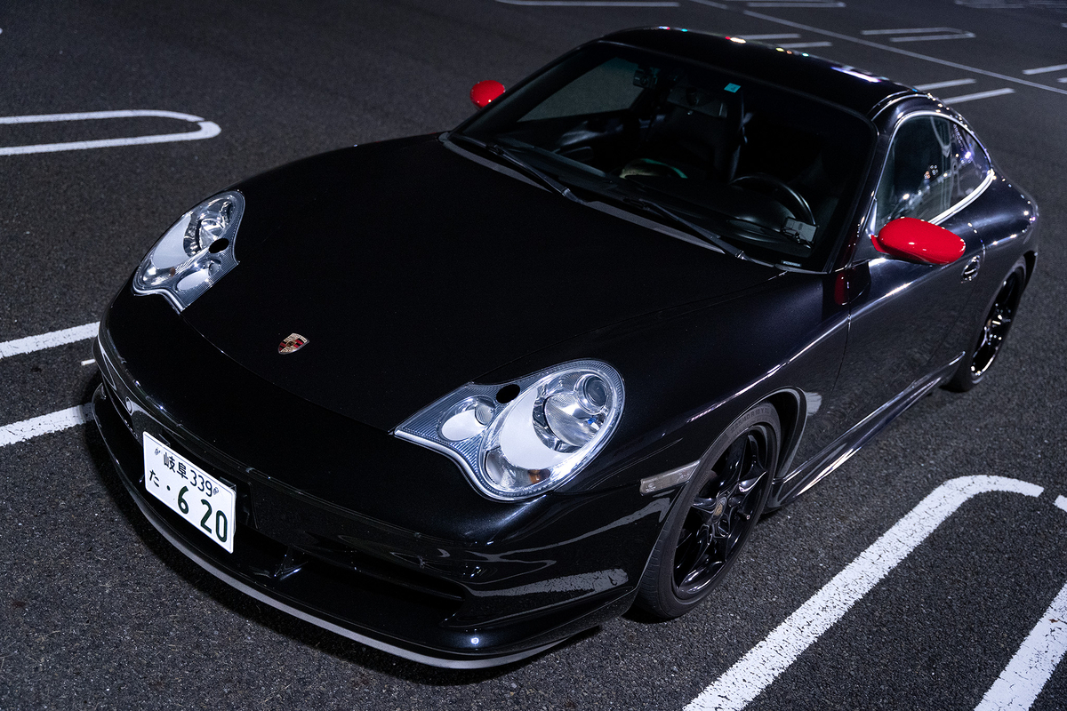聞くところによるとヘッドライトの中でもポルシェは特に表面のクリア層が硬いらしく、これの研磨に相当な時間と労力を要するそうな。お店に戻った時には既に研磨作業は終わっていて、あとはプロテクションフィルムを貼り付けする段階となっていました。ヘッドライトを外された996はどこか間抜け、どこか寂しげな佇まいです。また、ポルシェのヘッドライトは屋内保管をしていても劣化してしまうらしいので、ポジティブに言えば今回の施工はヘッドライト内部まで劣化が進行していないベストタイミングなのでは無いでしょうか。